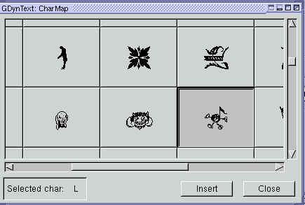 ÁíÒ»ÖÖÊäÈëͼ±êµÄ·½Ê½£¨Ò²ÊÇÎұȽÏϲ»¶µÄ£©ÊÇÀûÓÃÄãͨ¹ýµã»÷GDyntext´°¿ÚÉÏ·½ ×îÓұߵİ´Å¥µÄµÃµ½µÄCharMap´°¿Ú ÔÚCharmapÖÐÄã¿ÉÒÔ¿´µ½ÎÄ×Ö½çÃæÖÐËùÓпÉÓõķûºÅ£¬²¢¿ÉÒÔÔÚͼÐÎÖвåÈçËüÃÇ¡£ ÔÚ×óÏ·½ÄãÒ²¿ÉÒÔ¿´µ½ËüÃǶÔÓ¦µÄ¼ü¡£
